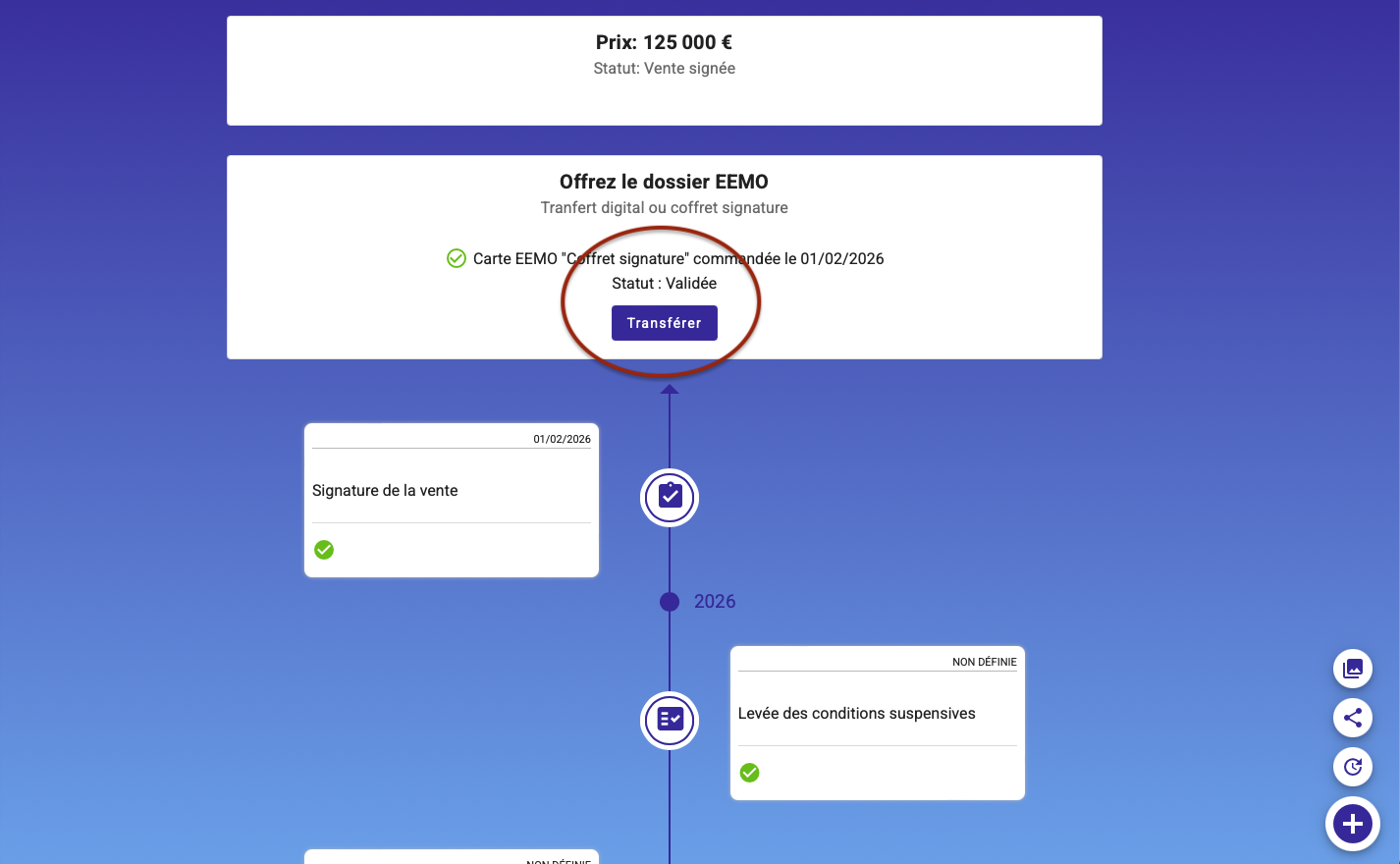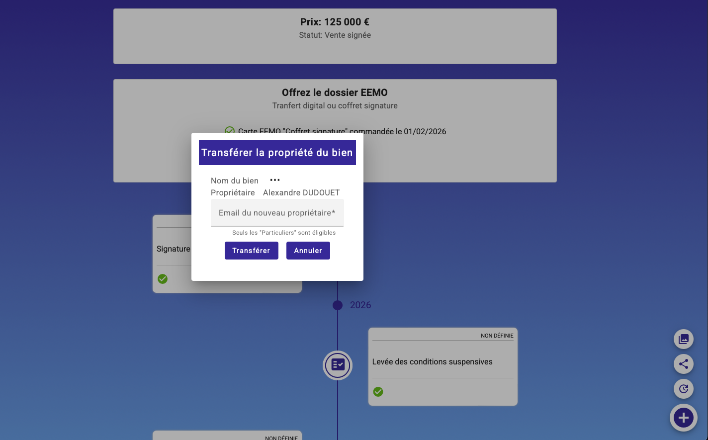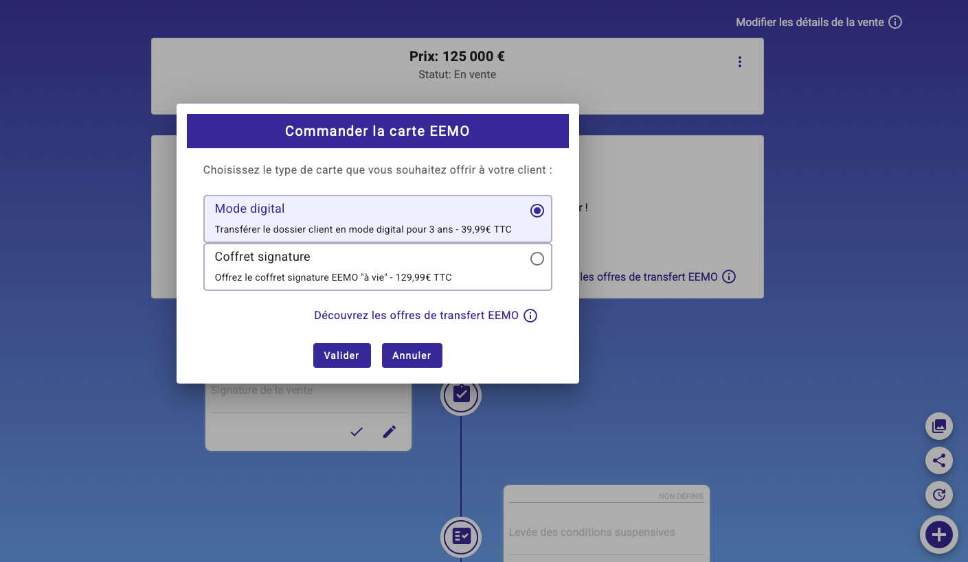 Lorsque vous faites une vente, EEMO vous propose d'offrir le dossier que vous avez créé à votre client acquéreur, il deviendra alors propriétaire, gestionnaire de son dossier EEMO, vous resterez l'agent référent dans la rubrique SERVICES du bien transféré.