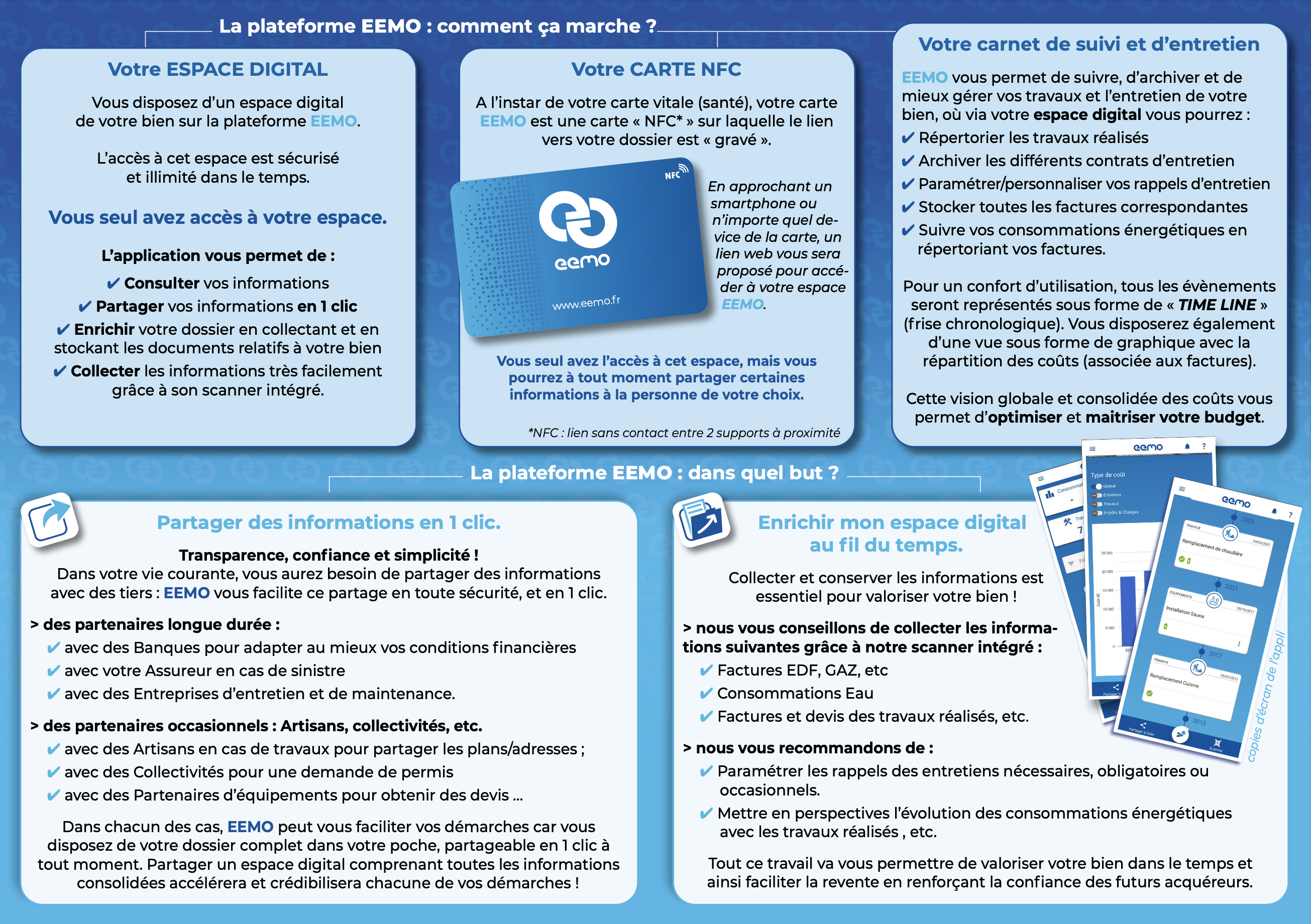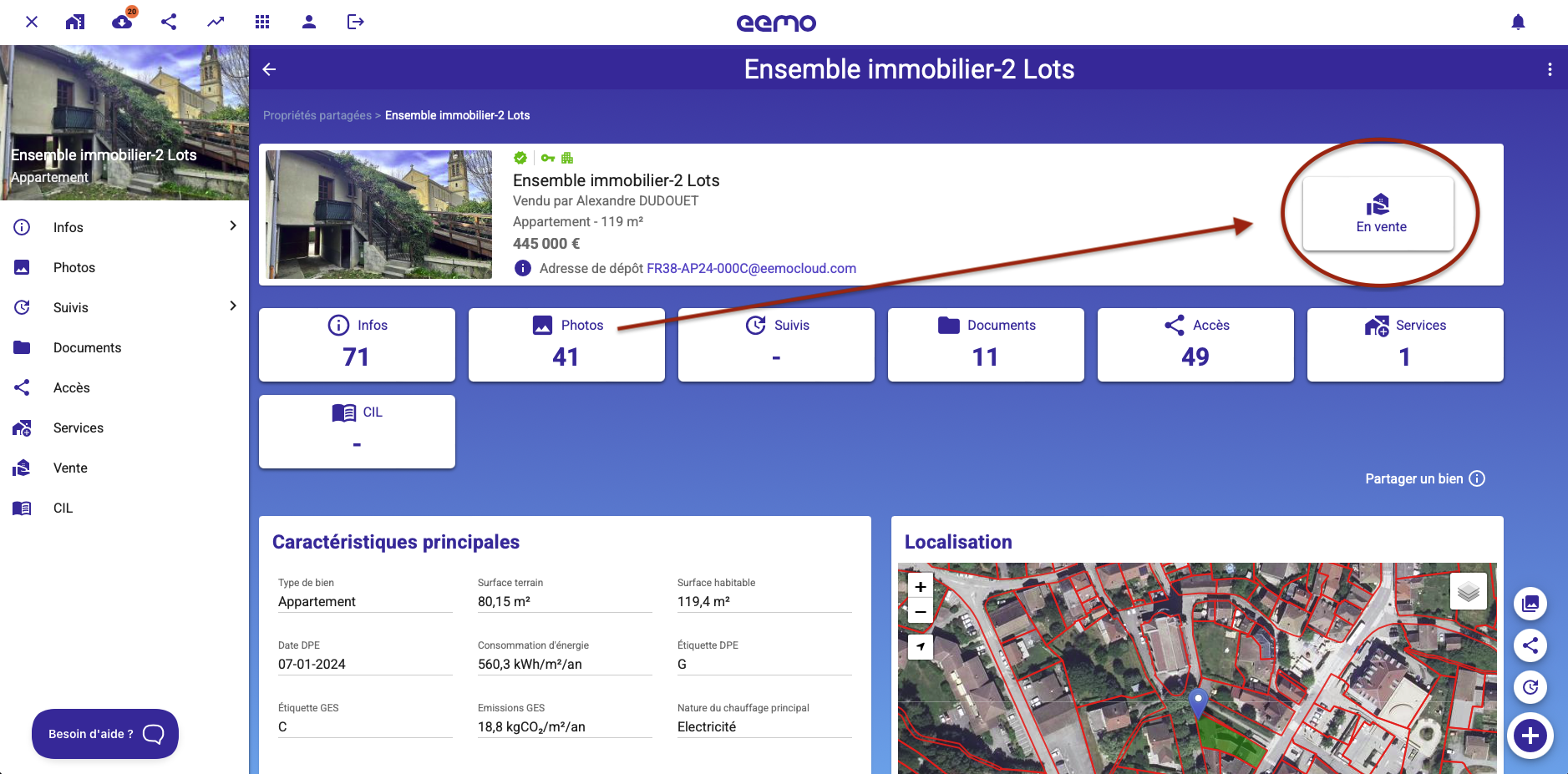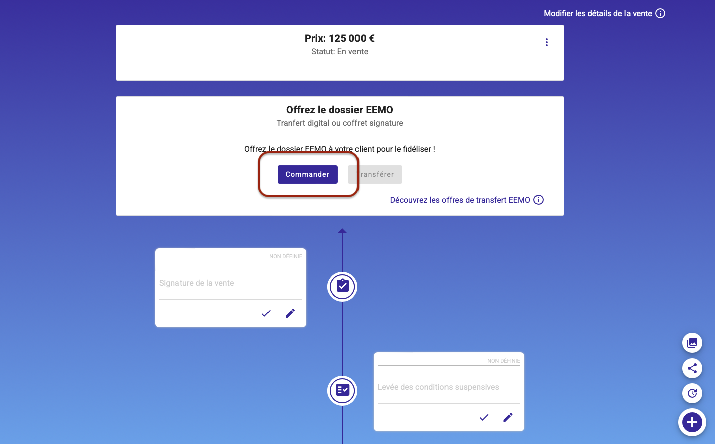 Lorsque vous faites une vente, EEMO vous propose d'offrir le dossier que vous avez créé à votre client acquéreur, il deviendra alors propriétaire, gestionnaire de son dossier EEMO, vous resterez l'agent référent dans la rubrique SERVICES du bien transféré.