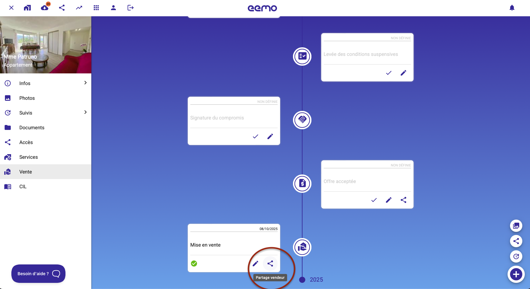 En cliquant sur l'onglet EN VENTE, vous accédez à une time line, qui vous donne accès à toutes infos et des fonctionnalités spécifiques à la vente :